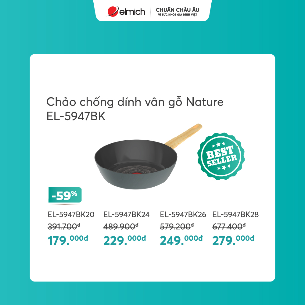 - Bộ nồi chảo chống dính vân gỗ Nature EL-5947BK size 20cm chỉ 179k, giá gốc 391k