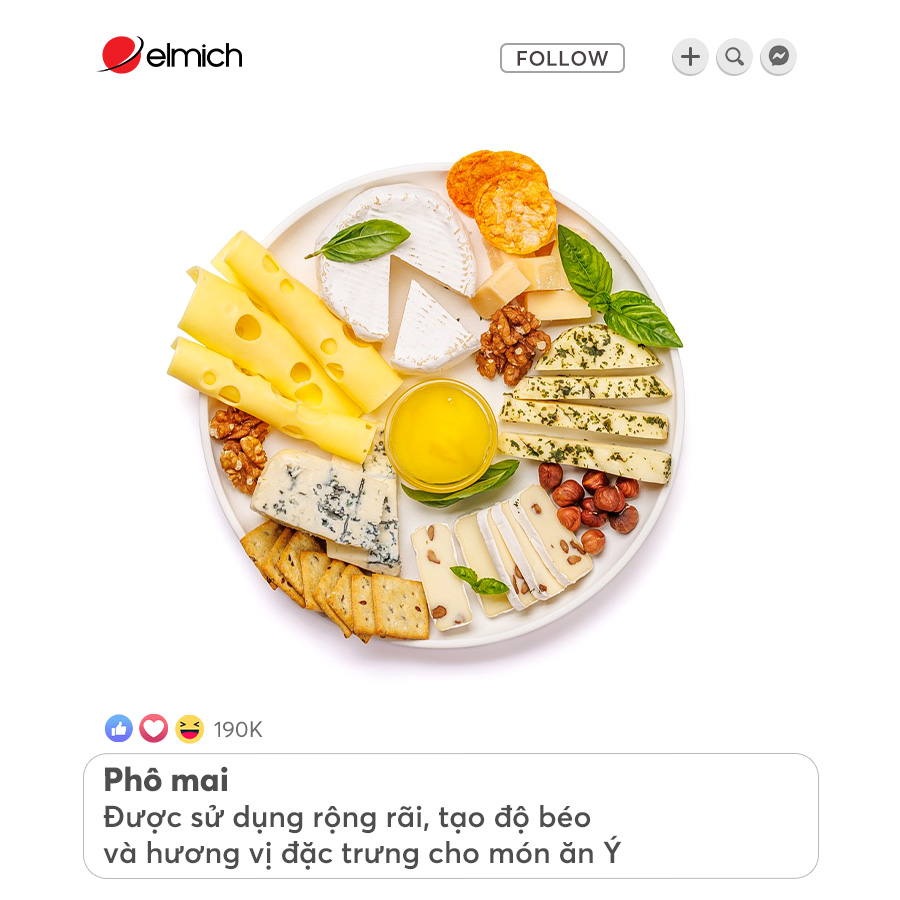 Phô mai: Các loại phô mai như mozzarella, parmesan, ricotta được sử dụng rộng rãi, tạo nên độ béo và hương vị đặc trưng cho món ăn.