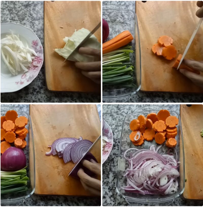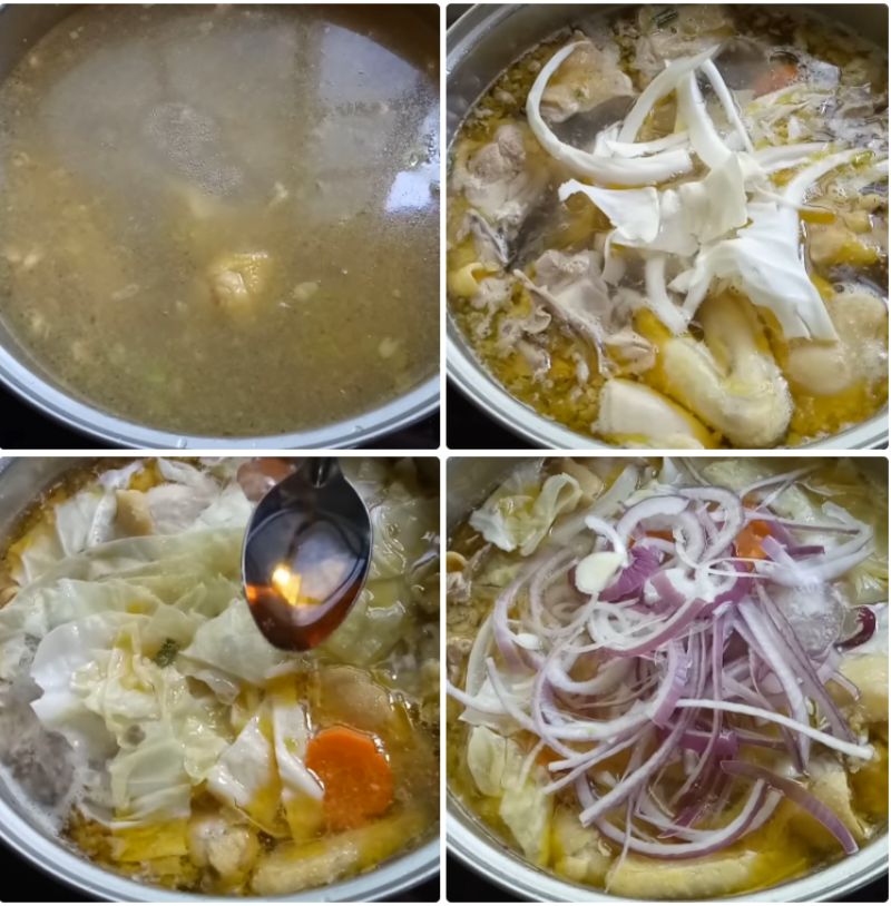 Cho hành tây, hạt tiêu và hành lá cắt nhuyễn vào. Sau đó thêm gà, cà rốt, bắp cải tùy theo sở thích. Chan nước dùng để làm chín sơ các loại rau gia vị trên mặt là được.