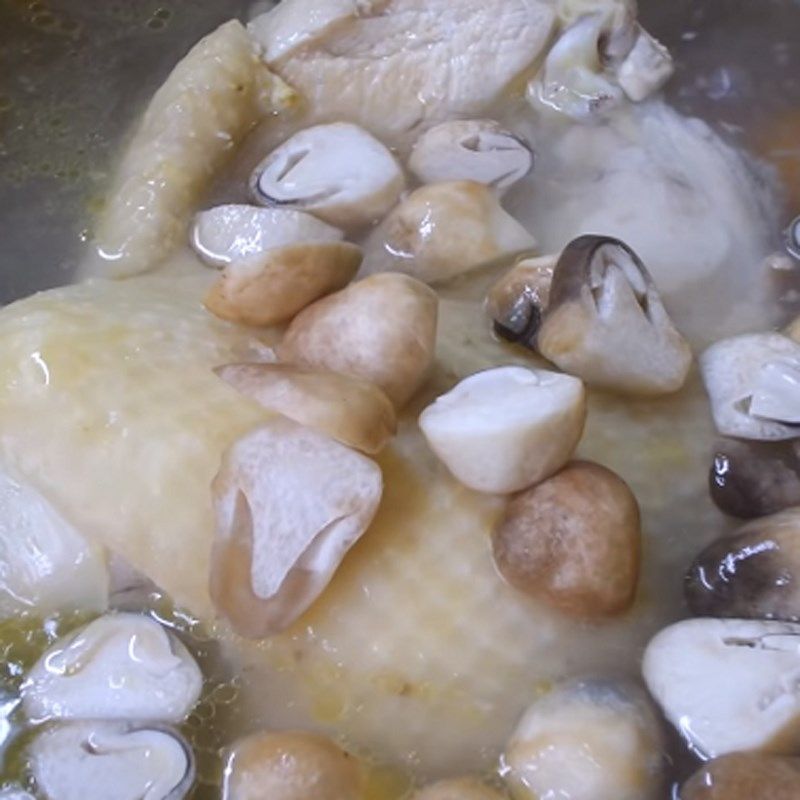 Nấu gà chín, bạn cho cà rốt và củ cải trắng, nấm rơm vào nồi nấu đến khi mềm. Gà vớt ra để riêng, sau đó nêm thêm vào nồi các loại gia vị sau đây: