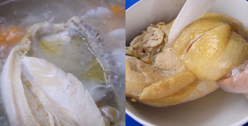 Cho gà đã sơ chế vào trong nồi, cho 2 lít nước hoặc vừa đủ ngập thịt gà là được. Vặn lửa lớn, đậy nắp kín và bắt đầu luộc gà. Khi nước sôi, nhẹ lửa lại để nấu gà trong khoảng 40 phút là gà chín hoàn toàn.
