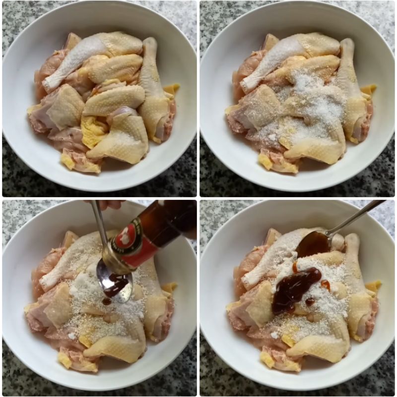 Với cách làm này, bạn làm sạch thịt gà sau đó chặt thành từng khúc vừa ăn. Sau đó cho thịt vào tô ướp với các gia vị sau trong 15 phút