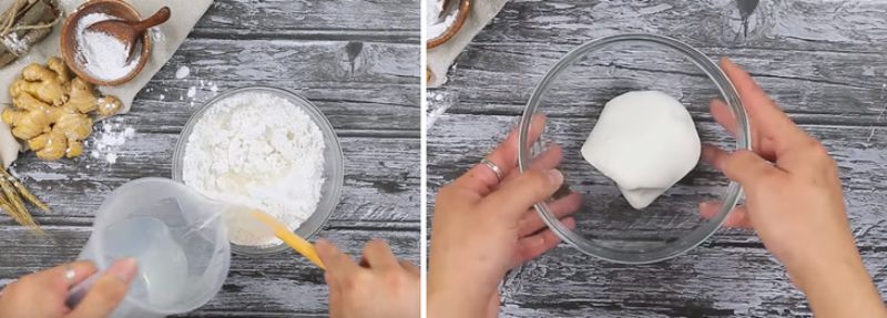 Bột nếp đã chuẩn bị bạn cho vào một tô lớn, thêm vào 1 nhúm muối trắng và 1 thìa dầu ăn. Sau đó trộn thật đều hỗn hợp, cho nước vào từ từ và bắt đầu trộn đến khi thấy bột vừa đủ ẩm thì dừng tay.