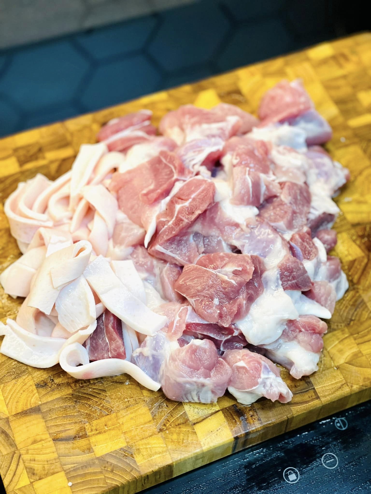 Thịt chân giò sau khi làm sạch, cắt thành miếng vừa ăn, ướp gia vị đậm đà để thịt thấm đều từng hương vị tinh tế.