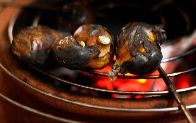 Gừng, hành tím đem nướng sơ trên lửa lớn cho thơm. Sau đó cạo bớt vỏ bên ngoài và rửa sạch với nước lạnh.