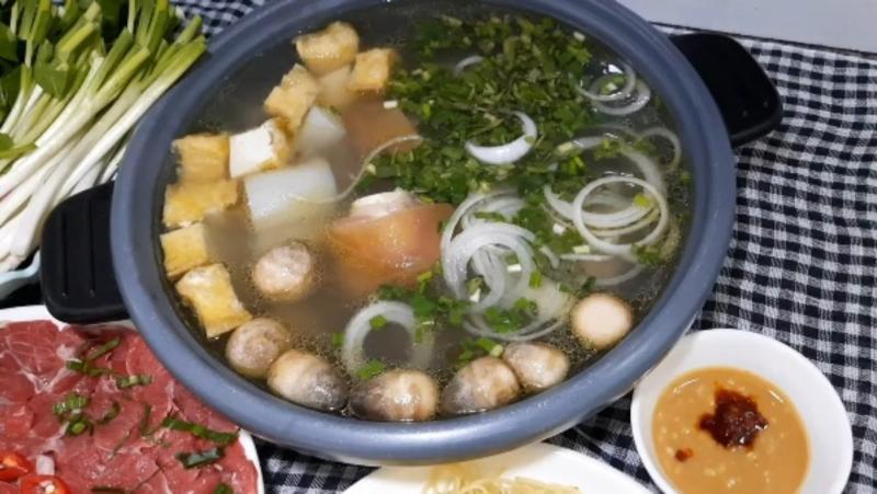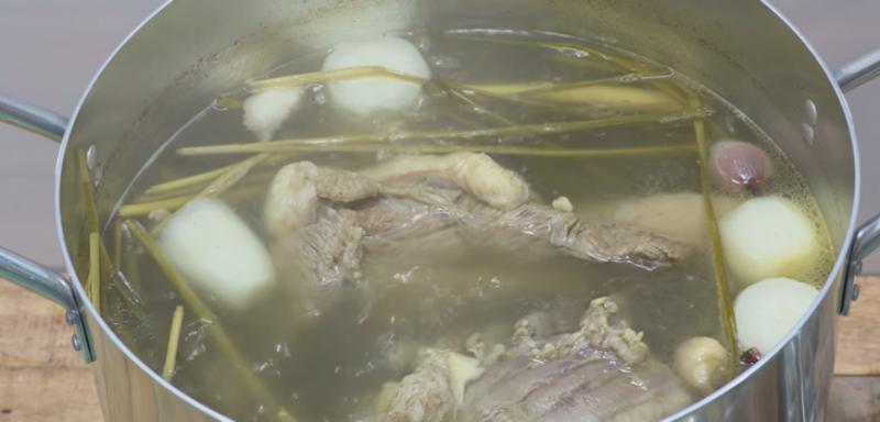 Trong quá trình hầm nước dùng cần vớt bọt, khi hoàn thiện nồi nước dùng cần trong như hình