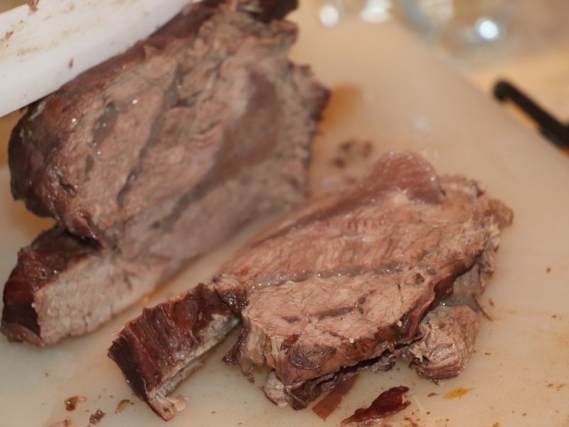 Tiếp tục hầm bò trong nồi khoảng 1,5 tiếng cho bò mềm hoàn toàn. Sau thời gian này, bạn vớt phần cổ bò và nạm bò ra. Để thịt trong nhiệt độ phòng cho đến khi nguội hoàn toàn thì dùng dao sắc cắt thành những miếng vừa ăn.
