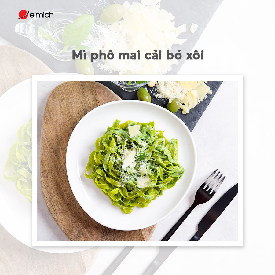 - Cho mì ống, cải bó xôi đã xay và phô mai vào chảo, khuấy đều trên lửa nhỏ cho đến khi phô mai tan chảy và thấm đều vào mì.