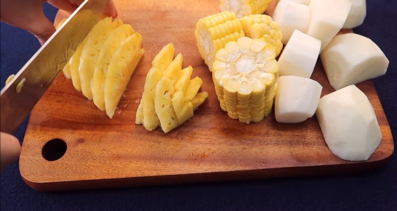 Củ sắn, củ cải trắng gọt bỏ vỏ, ngô bóc vỏ bỏ râu. Sau đó cắt tất cả thành từng khúc dài khoảng 2cm.