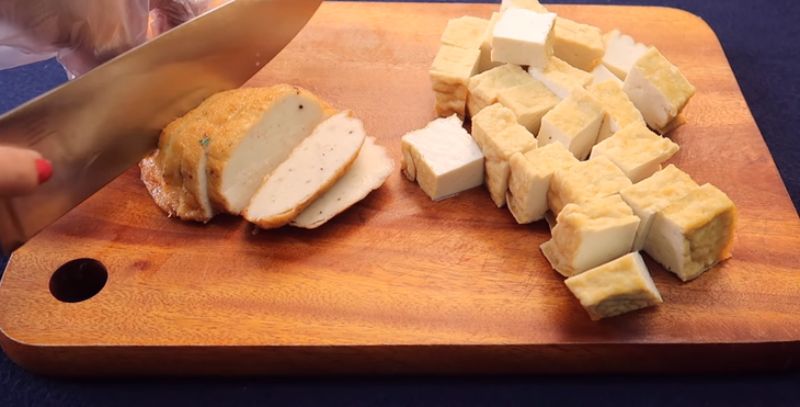 Sả đập dập, cắt làm đôi. Đậu hũ cắt thành từng viên vuông nhỏ. Chả chay đã mua cắt thành từng lát mỏng.