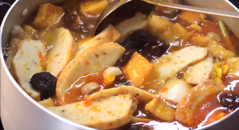 Cho phần chân nấm đã xào vào trong nồi nước dùng. Sau đó thêm đậu hũ chiên, chả chay vào nồi cùng với sả đập dập. Nấu thêm khoảng 10 phút nữa, chú ý liên tục hớt bọt trong suốt quá trình này.