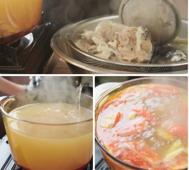 Vớt hết xương, đầu cá ra khỏi nồi nước hầm, lọc nước qua rây cho trong.