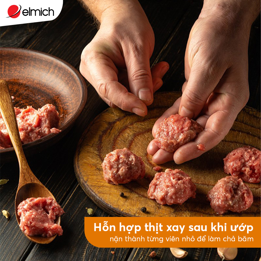 - Thịt xay viên thành từng viên nhỏ làm chả băm. Thịt ba chỉ xiên vào que xiên.