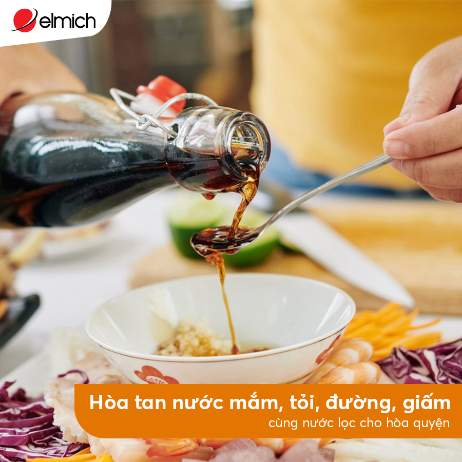- Hòa tan nước mắm, tỏi, đường, giấm cùng nước lọc cho hòa quyện. Có thể đun trên bếp với lửa nhỏ để đường tan hết và giữ ấm được nước chấm đến khi dùng.