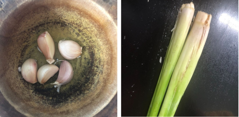Sả rửa sạch, 2 cây đập dập, 4 cây còn lại cắt thành từng khoanh tròn mỏng, cho vào cối giã nhuyễn. Hoặc bạn có thể dùng dao sắc bản lớn và băm thật nhỏ sả là được.