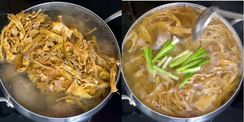 Bạn vớt hành tây ra khỏi nồi nước dùng đã ninh, cho măng khô đã xào vào nồi và đun với lửa vừa. Nêm thêm ½ thìa canh đường phèn và 1 thìa cafe muối trắng, nấu nồi nước dùng thêm khoảng 1 phút nữa.