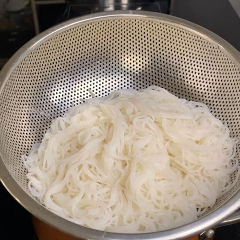 Bạn cho vào nồi 1 lít nước, đun sôi. Khi nước sôi bùng lên thì cho bún khô vào trần trong khoảng 5 phút. Vớt bún ra rổ, xả lại với nước lạnh cho đến khi bún nguội hoàn toàn thì để cho ráo nước.
