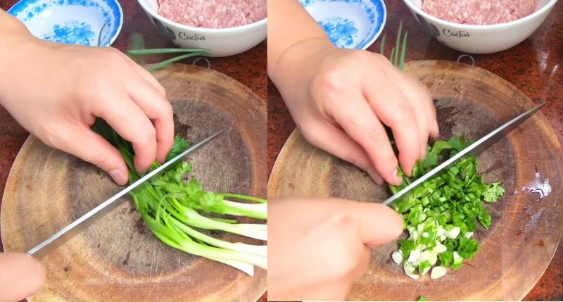 Hành lá và ngò rí nhặt bỏ cuống, rễ cùng các lá dập, xấu. Cuối cùng rửa sạch và để ráo nước hoàn toàn.