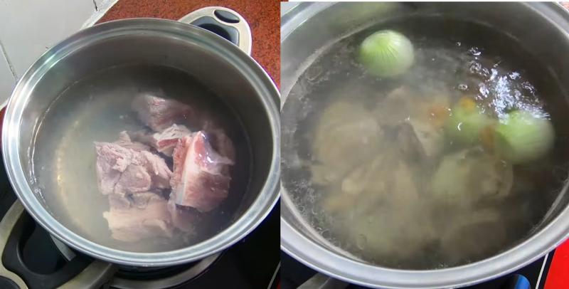 Trong một cái nồi lớn, bạn cho vào 500 ml nước đun đến sôi thì thả xương sườn vào chần sơ trong 3 phút ở mức lửa lớn. Sau đó tắt bếp, vớt sườn ra rửa lại nước 1 lần cho sạch bọt bẩn và mùi hôi.