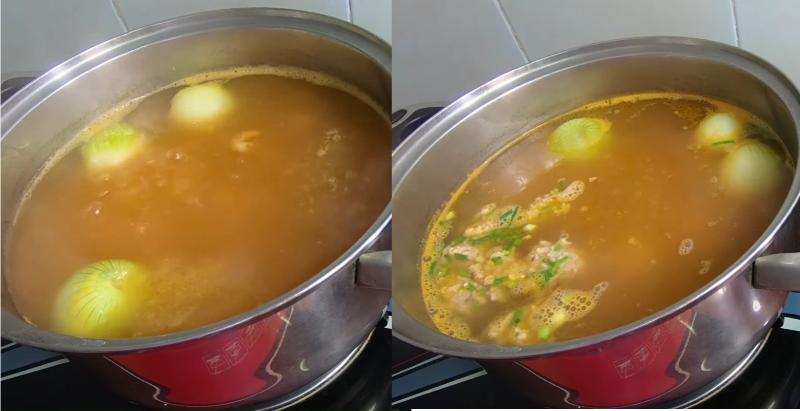 Khi nước sôi lớn, bạn cho 3,5 củ hành tây và 20 gam tôm khô. Hầm trong nồi thêm khoảng 25 phút nữa là được.
