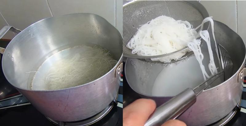 Sau đó, bạn bắc 1 cái nồi khác lên bếp đun với 500 ml nước trong mức lửa vừa. Khi nước sôi, bạn trụng bún gạo trong nồi khoảng 5 phút cho đến khi bún chín mềm thì vớt bún ra rổ, để cho ráo nước hoàn toàn.