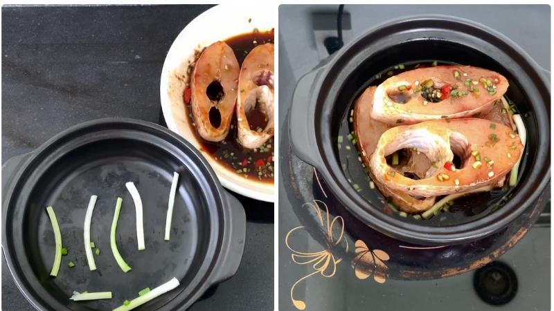 Xếp những phần đầu hành đã chuẩn bị dưới đáy nồi để chống dính. Sau đó xếp cá lên trên, đổ hết phần nước ướp cá trong bát vào nồi.