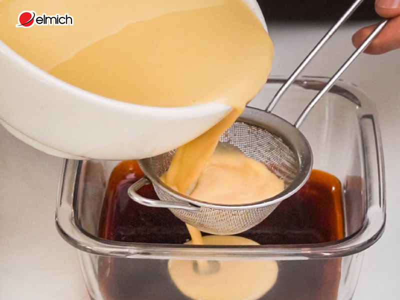 Lọc hỗn hợp qua rây để loại bỏ bọt và cặn trứng. Rót hỗn hợp vào khuôn đã có sẵn lớp caramel.