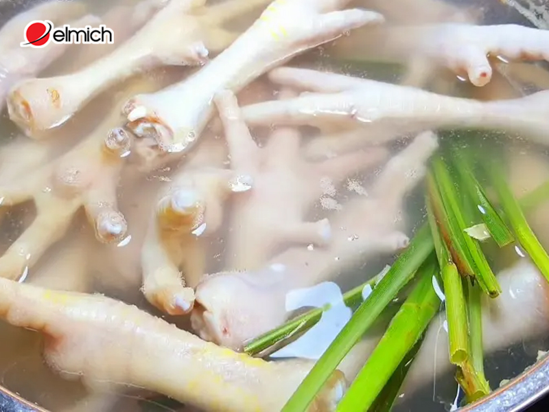 Tiếp theo, bạn cho chân gà vào nồi nước cùng muối, một ít rượu gạo, vài cây sả và hành tím đập dập để khử mùi tanh và tăng hương thơm. Luộc đến khi chân gà vừa chín thì tắt bếp, không nên luộc quá lâu vì sẽ làm chân gà bị mềm, mất độ giòn.