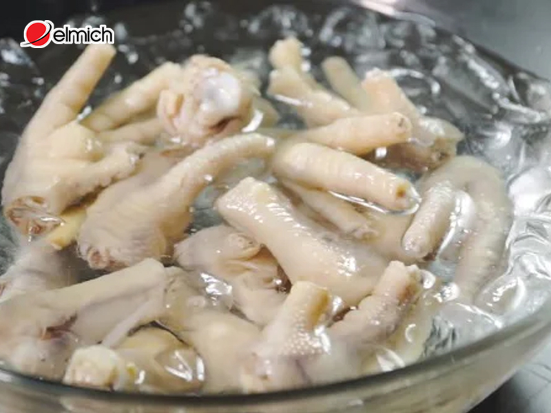 - Sau khi vớt ra, cho ngay chân gà vào thau nước đá lạnh để giúp chân gà săn chắc, giữ độ giòn sần sật và màu sắc trắng đẹp.