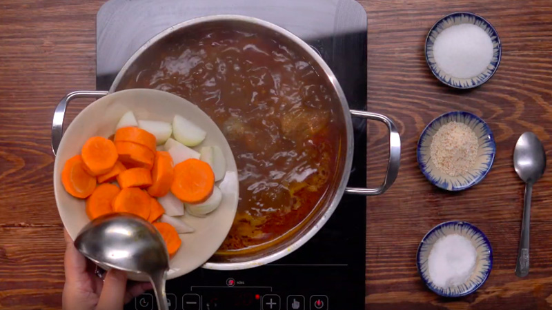 Khi thịt đã gần chín, cho cà rốt vào và tiếp tục nấu thêm 15 – 20 phút. Cà rốt vừa làm món ăn thêm vị ngọt thanh, vừa tạo độ cân bằng cho nước dùng. Lúc này, bạn có thể nêm nếm lại bằng nước mắm hoặc đường để hợp khẩu vị gia đình.