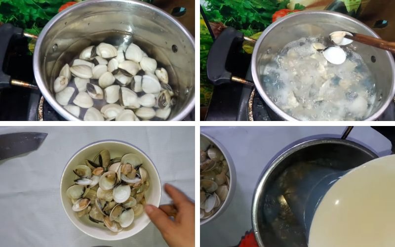 Bước tiếp theo vô cùng quan trọng đó là luộc ngao, trước khi luộc nên ngâm 15 phút rồi rửa nhiều lần với nước. Bắc một nồi nước lớn lên bếp, sau đó cho toàn bộ ngao đã rửa vào trong nồi. Đậy nắp và chờ sôi bùng lên, tiếp theo đó lọc thịt ngao và nước ngao ra hai phần riêng biệt.