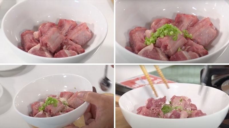 - Ướp sườn non với ¼ muỗng cà phê tiêu, ¼ muỗng cà phê muối, ¼ muỗng cà phê đường, 1 muỗng cà phê hành lá và ½ muỗng cà phê hạt nêm rồi trộn đều. Tiếp đến, cho 1 muỗng cà phê dầu mè và một ít nước bột năng, trộn đều và ướp khoảng 15 phút.