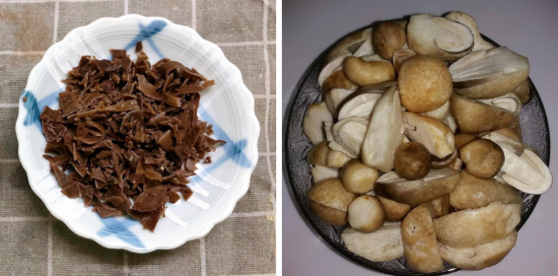 Nấm rơm bạn đem làm sạch, ngâm nấm rơm, nấm mèo trong nước muối loãng khoảng 15 phút rồi vắt thật sạch để ra hết các chất bẩn ở bên trong. Rửa lại kỹ với nước lạnh 2, 3 lần sau đó để ráo hết nước. Nấm rơm bạn cắt dọc đôi theo thân. Còn nấm mèo thì cắt nhuyễn hoặc đem xay nhuyễn đều được.