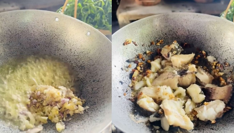 Khi hành và tỏi dậy mùi, bạn cho phần thân cá vào trong chảo, xào sơ nhẹ tay trong 3 phút. Cuối cùng rắc thêm 1 chút hạt tiêu lên trên là được. Cách này giúp cá bớt thanh đi rất nhiều so với việc nấu mà không xào.