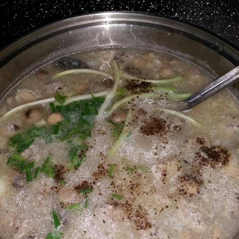Gạo đã nhừ thì bạn cho nấm rơm, trứng cút, thịt viên vào nồi. Nấu nhỏ lửa khoảng 10 phút rồi nêm nếm lại gia vị vừa ăn cho cháo. Rắc hành lá cắt khúc lên trên, thêm 1 chút tiêu vào nồi và khuấy đều rồi tắt bếp.