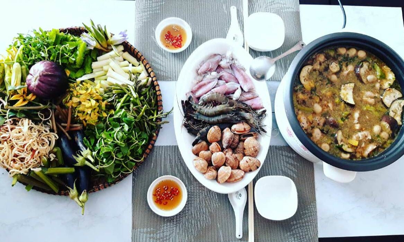 Khi ăn lẩu, bạn ăn kèm với rau đắng, kèo nèo, các loại bún, mì, rau bông súng rất tuyệt. Bạn có thể tùy chỉnh các loại rau, hải sản để lẩu phù hợp nhất với sở thích của gia đình mình.