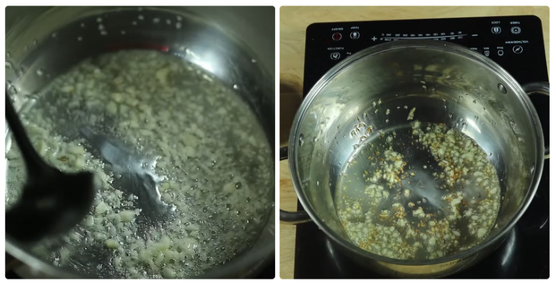 Trong một nồi khác, bạn cho vào 2 thìa canh dầu ăn. Bật bếp ở mức lửa lớn, nấu đến khi dầu nóng. Nếu bạn thấy dầu sôi lăn tăn thì nhanh tay cho 2 thìa tỏi băm vào phi thật thơm.