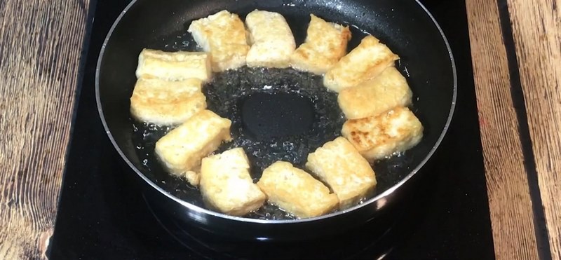 Đậu phụ cắt thành miếng nhỏ rồi đem lên chảo dầu chiên đến khi vàng đều cả hai mặt thì vớt ra. Bước này phải cẩn thận, tránh làm đậu bị vỡ nát vừa mất thẩm mỹ vừa ảnh hưởng đến chất lượng món ăn.