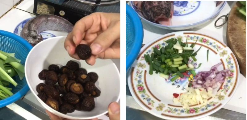 Nấm hương mua về bạn ngâm vào nước sạch, khi nấm nở thì nhẹ nhàng chà xát để loại bỏ hết chất bẩn. Sau đó vắt nước để ráo trước khi nấu canh.