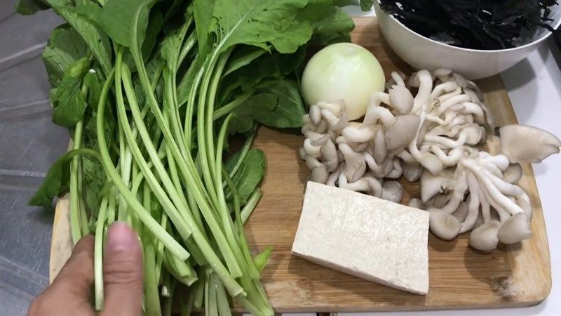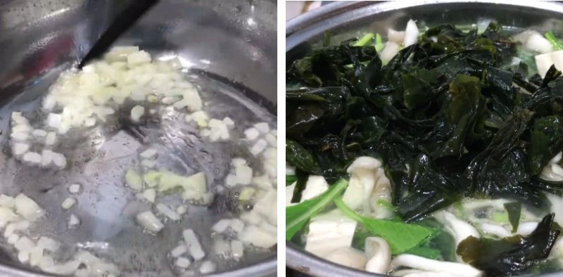 Để nước sôi sau đó cho cải ngọt, nấm, rong biển và đậu hũ vào nồi. Khi nước sôi lại, thêm các loại gia vị, 1 chút hạt tiêu sau đó có thể ăn được ngay.