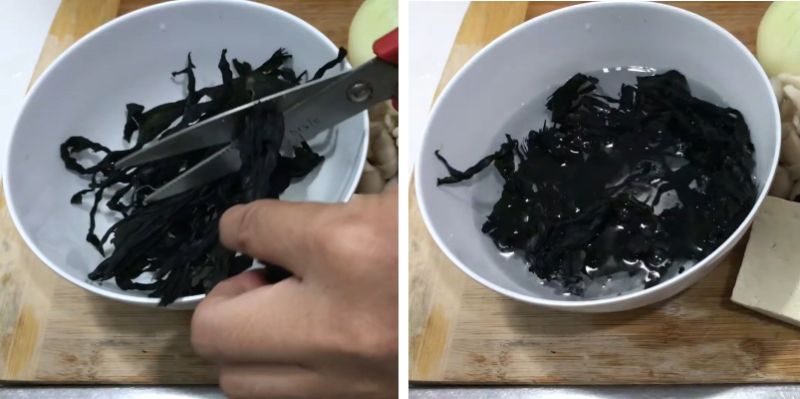 Rong biển khô sau khi mua về, bạn cắt nhỏ thành từng khúc vừa ăn với chiều dài khoảng 2 lòng tay. Sau đó bỏ rong biển ra tô, đổ nước ngập vào phần rong biển. Ngâm khoảng 15 phút, sau đó bóp nhẹ nhàng rồi để rong biển vào rổ cho ráo nước.