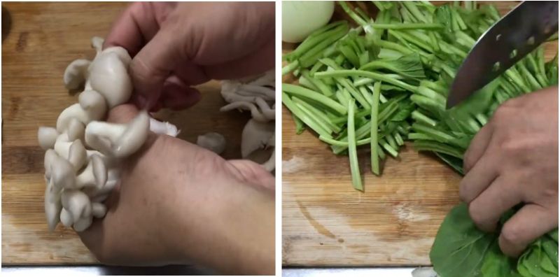Nấm bào ngư bạn dùng dao cắt đi gốc nấm, sau đó xé ra thành từng cọng. Ngâm nấm trong nước muối loãng để làm sạch hoàn toàn. Vớt nấm ra, vắt nhẹ cho ráo nước.