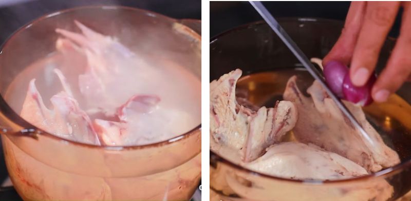 Chuẩn bị 1,5 lít nước, đập dập 2 củ hành tím thả vào sau đó nấu nước dùng với xương gà. Hầm nước trong 15 phút, liên tục vớt bọt cho sạch.