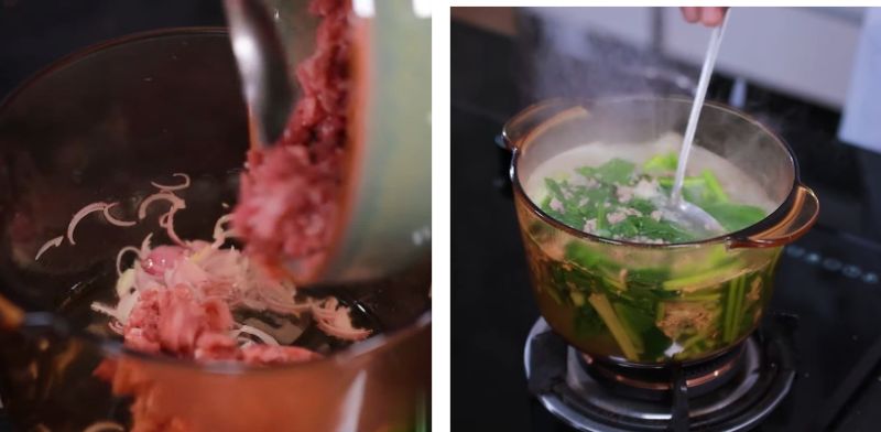 Cắt lát 1 củ hành tím, phi vàng và cho thịt đã ướp vào xào. Thịt săn lại thì đổ 1 lít nước dùng vào nấu chung.