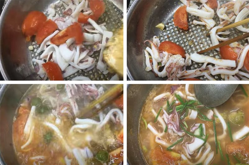 Chuẩn bị nước canh chua là bước tiếp theo, đun sôi nước trong nồi, sau đó đưa mực đã xào vào nấu cho chín mềm. Việc vớt bọt nổi giúp canh trở nên trong suốt và thanh mát hơn.