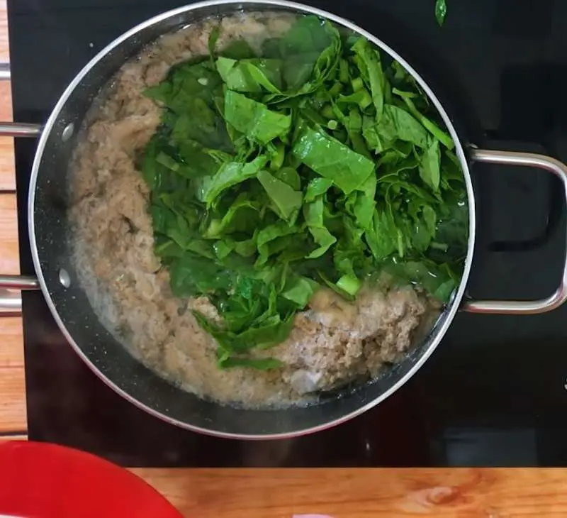 Cho rau và gạch cua vào nước thịt cua rồi nêm lại gia vị sao cho vừa ăn nhé