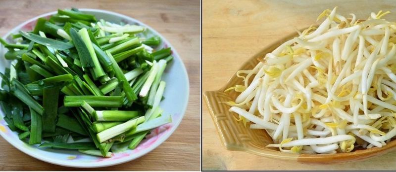 Giá đỗ, hẹ tươi nhặt sạch gốc và những cọng dập. Sau đó rửa kỹ với nước lạnh và để ráo nước.