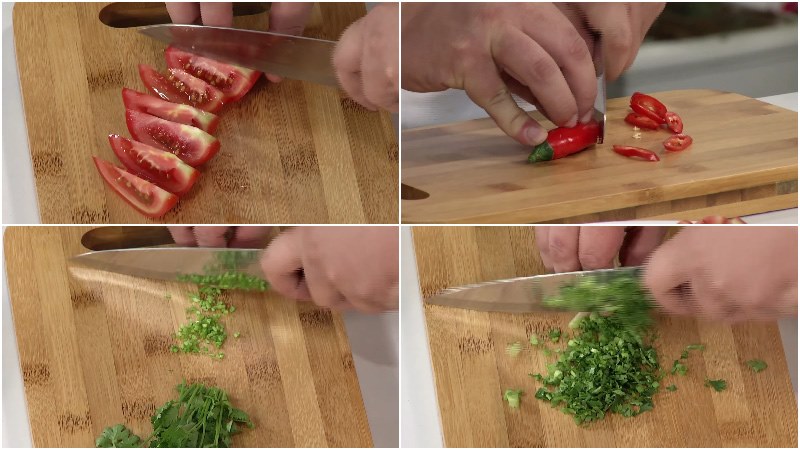 Cà chua được cắt thành múi cau, ớt sừng được cắt lát mỏng, và ớt hiểm được băm nhuyễn.