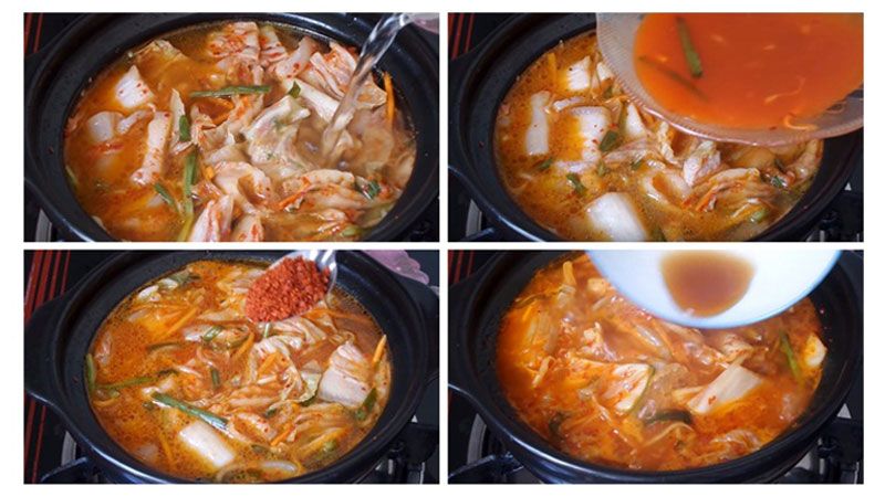 Sau khoảng 2 phút, bạn thêm vào nồi trên 300ml nước lọc và phần nước kim chi đã tách ra từ kim chi. Sau đó nêm thêm 1 thìa cafe ớt bột của Hàn Quốc, 2 thìa nước mắm vào sẽ giúp canh đẹp mắt, có vị hấp dẫn hơn nhiều.