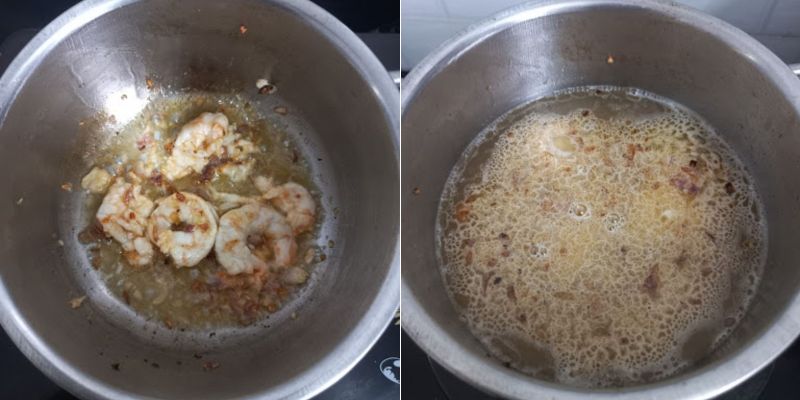 Bắc nồi lên bếp phi ½ thìa canh dầu ăn và phi thơm hành tím băm nhuyễn. Cho số tôm đã chuẩn bị vào xào khoảng 3 phút cho tôm chuyển màu. Thêm vào nồi 500 ml nước và đun sôi, đồng thời tăng lửa lên mức lớn nhất, nấu trong khoảng 7 phút cho tôm ra nước, ngọt canh hơn.